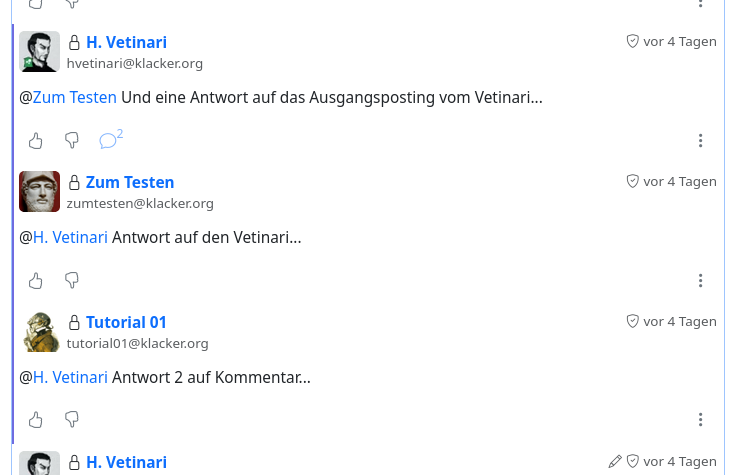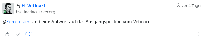 Gibt es mehr Kommentare, als die drei angezeigten, so erscheint unter dem Startbeitrag die Schaltfläche “–––”. Klickt man auf diese, so werden die restlichen Kommentare geladen und in chronologischer Reihenfolge angezeigt.