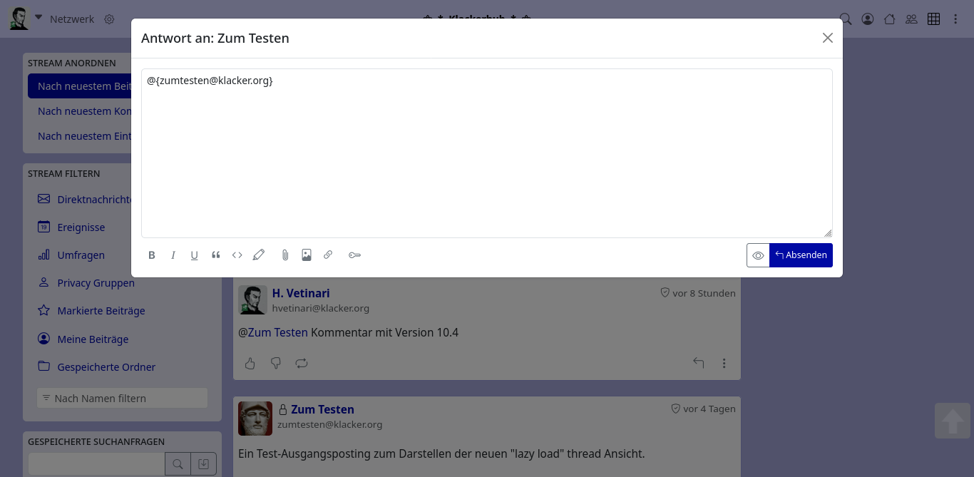 geöffnet wird, ist nun ein modaler Dialog. Es wird kein Eingabefeld unter dem zu kommentierenden Posting angezeigt, sondern der Editor wird als überlagerndes Fenster zur Verfügung gestellt.