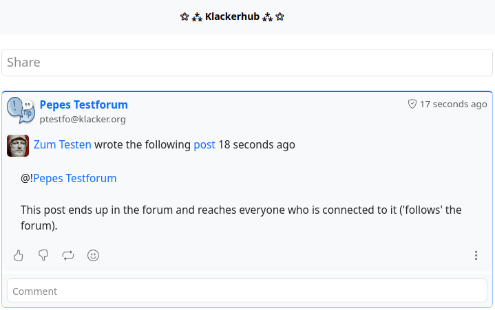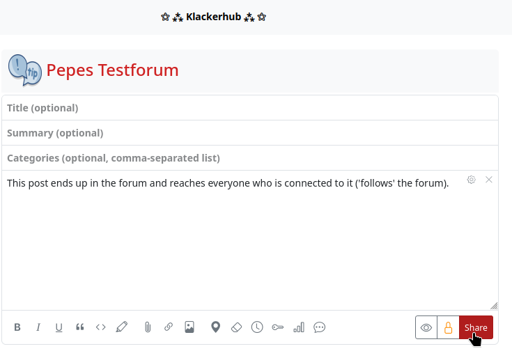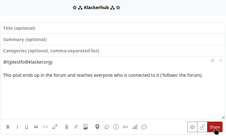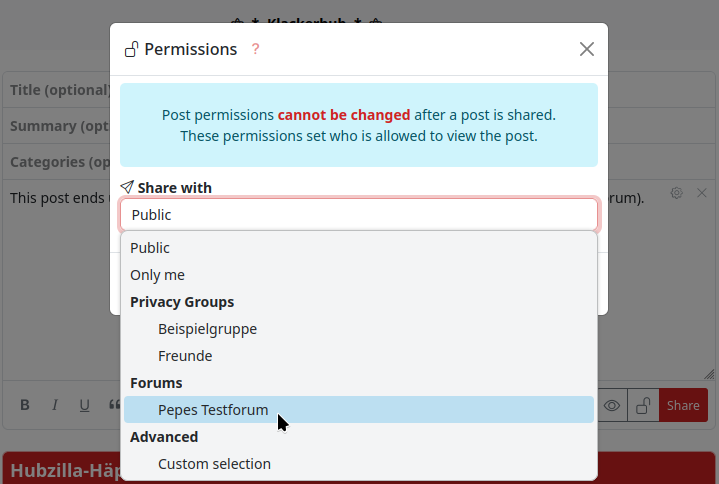 - With ‘@!-Mention’… that means you write in your post, which should end up in the forum, an exclamation mark, which is immediately followed by the channel name (forum name). Example: You want to post a post in the (fictitious) forum ‘Hubzillafans’. You create a new post (directly from the stream view or with the app ‘Write post’. Now mention the forum in the post text by using