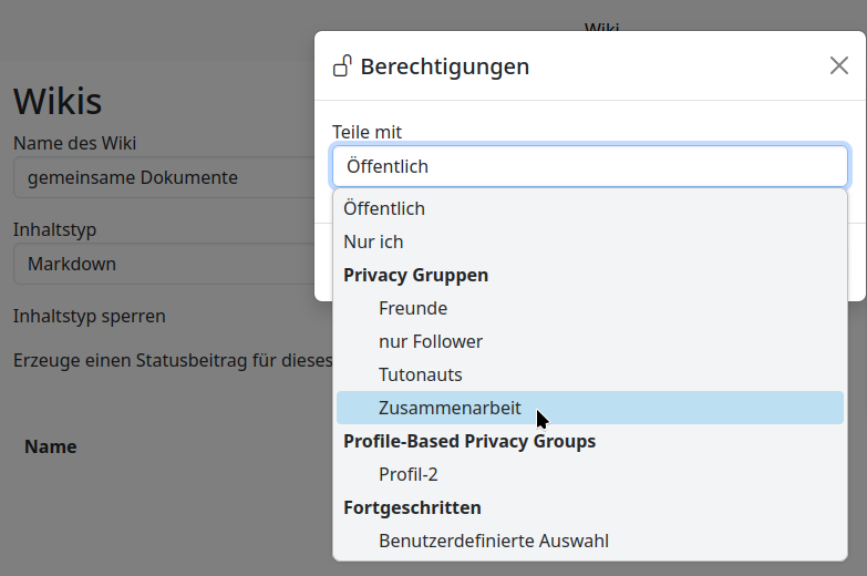 Generell ist es bei allen Standard-Kontaktrollen jedem möglich, die Wiki-Seiten zu sehen. Das passt für öffentliche Wikis auch gut, aber für die meisten Anwendungsfälle einer gemeinsamen Bearbeitung von Dokumenten ist das nicht erwünscht oder geboten. Deshalb muss die grundsätzliche Genehmigung für das Betrachten von Wikiseiten für das Dokumenten-Wiki eingeschränkt werden. Die Berechtigungen aus der Kanalrolle sind nicht widerrufbar, sodass es über eine Standard-Kontaktrolle nicht funktioniert. Die Einschränkung erfolgt über die Berechtigungs-Einstellungen (Vorhangschloss Button 🔒 neben dem Button “Absenden”). Dort kann man entweder über die Einstellung “Benutzerdefinierte Auswahl” die einzelnen Verbindungen als einzige berechtigen, das Dokumenten-Wiki zu sehen, oder man nutzt die praktischere Variante, eine Privacy Gruppe, die man erstellt und in welche man alle Mitarbeiter einsortiert. Letzteres hat den Vorteil, dass man, wenn man dann die Kontaktrolle zur Zusammenarbeit erstellt hat, diese Kontaktrolle allen Mitgliedern der Privacy Gruppe zuzuweisen. Damit hat man beide Berechtigungs-Einstellungen mit einem Handstreich erledigt.